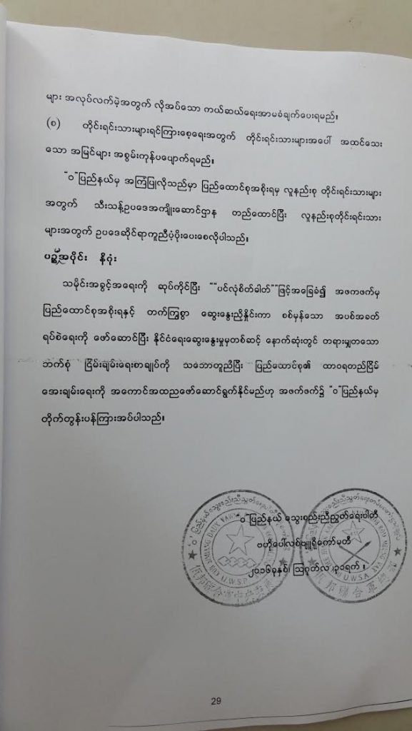 - Source (2): “၂၁ရာစု ပင်လုံညီလာခံတွင် တင်ပြမည့် “ဝ”ပြည်နယ်၏ အထွေထွေမူဝါဒနှင့် အသေးစိတ်တောင်း ဆိုချက်များ” | Tachileik News Agency | 1st September 2016
